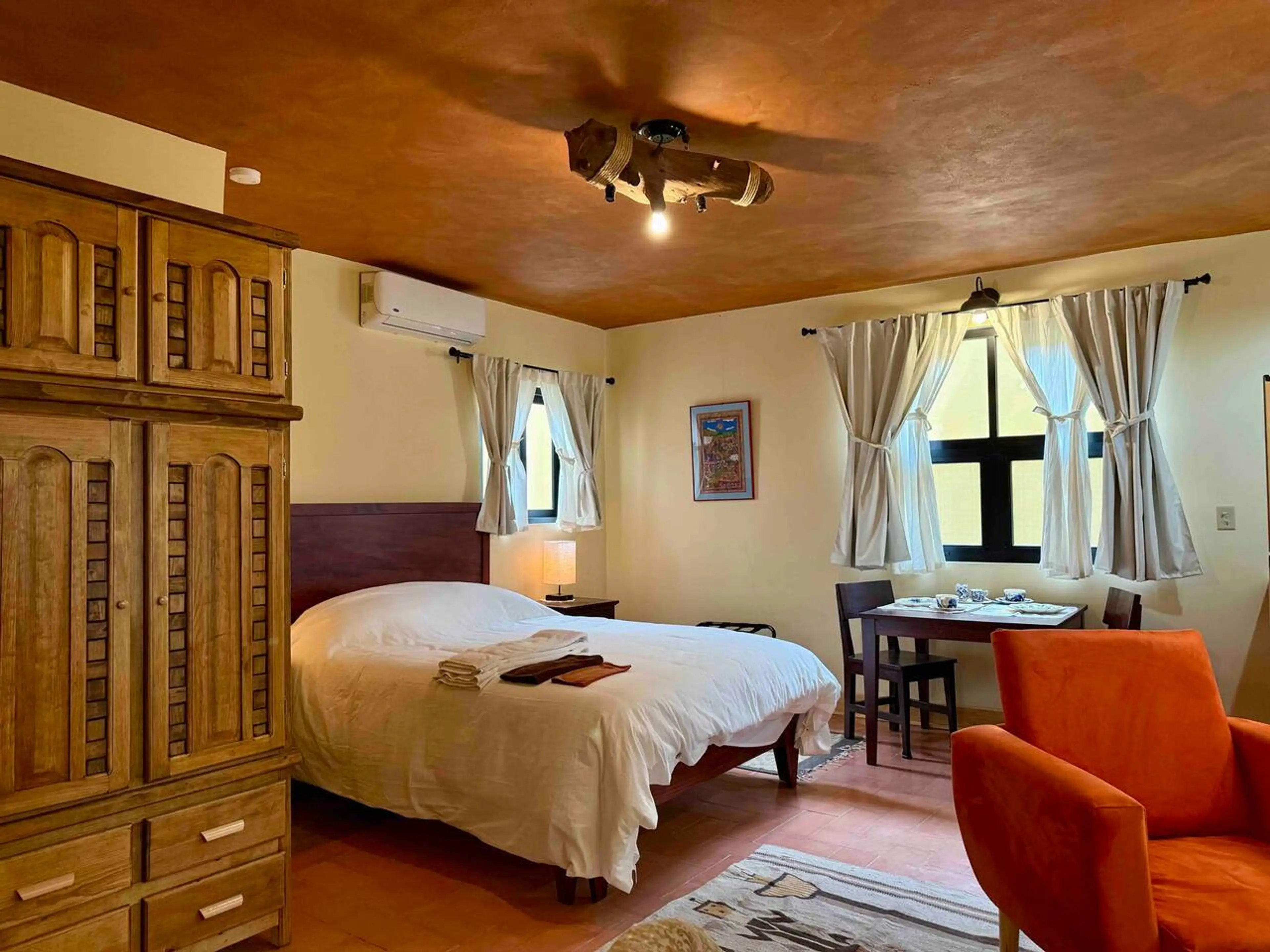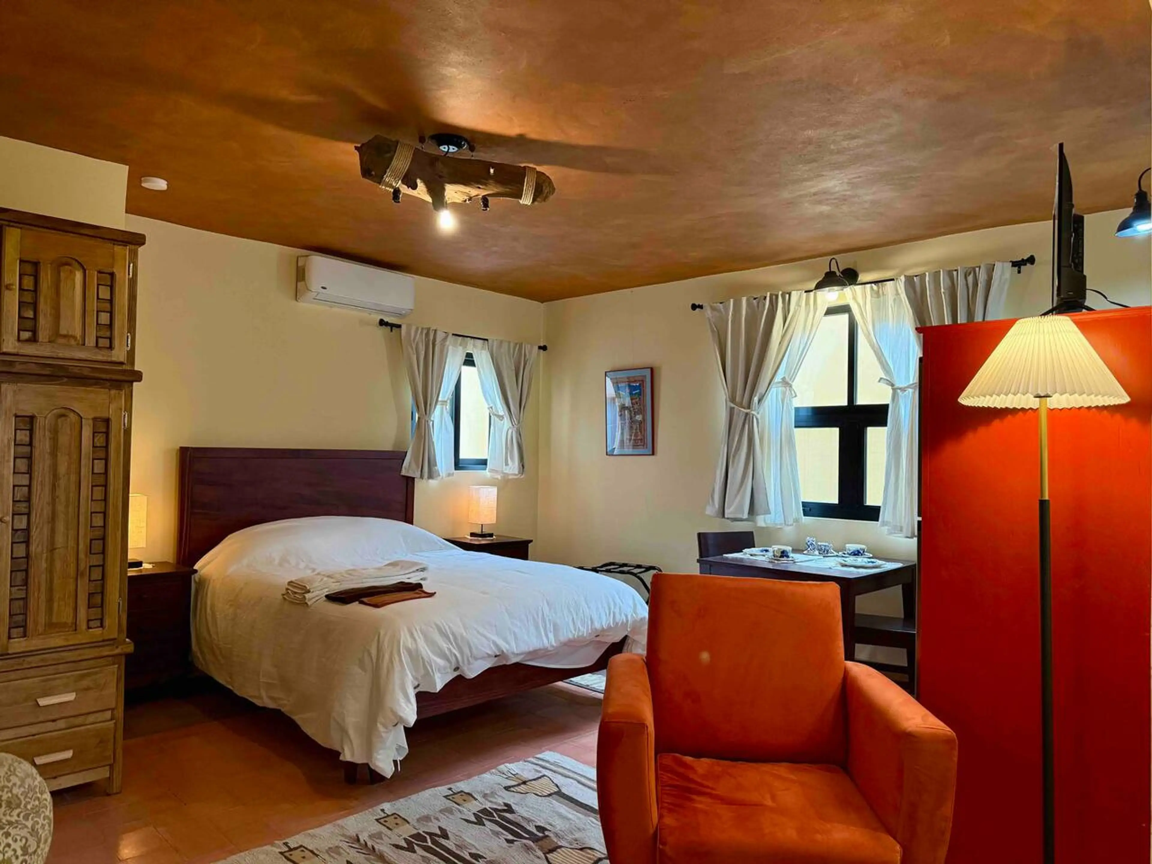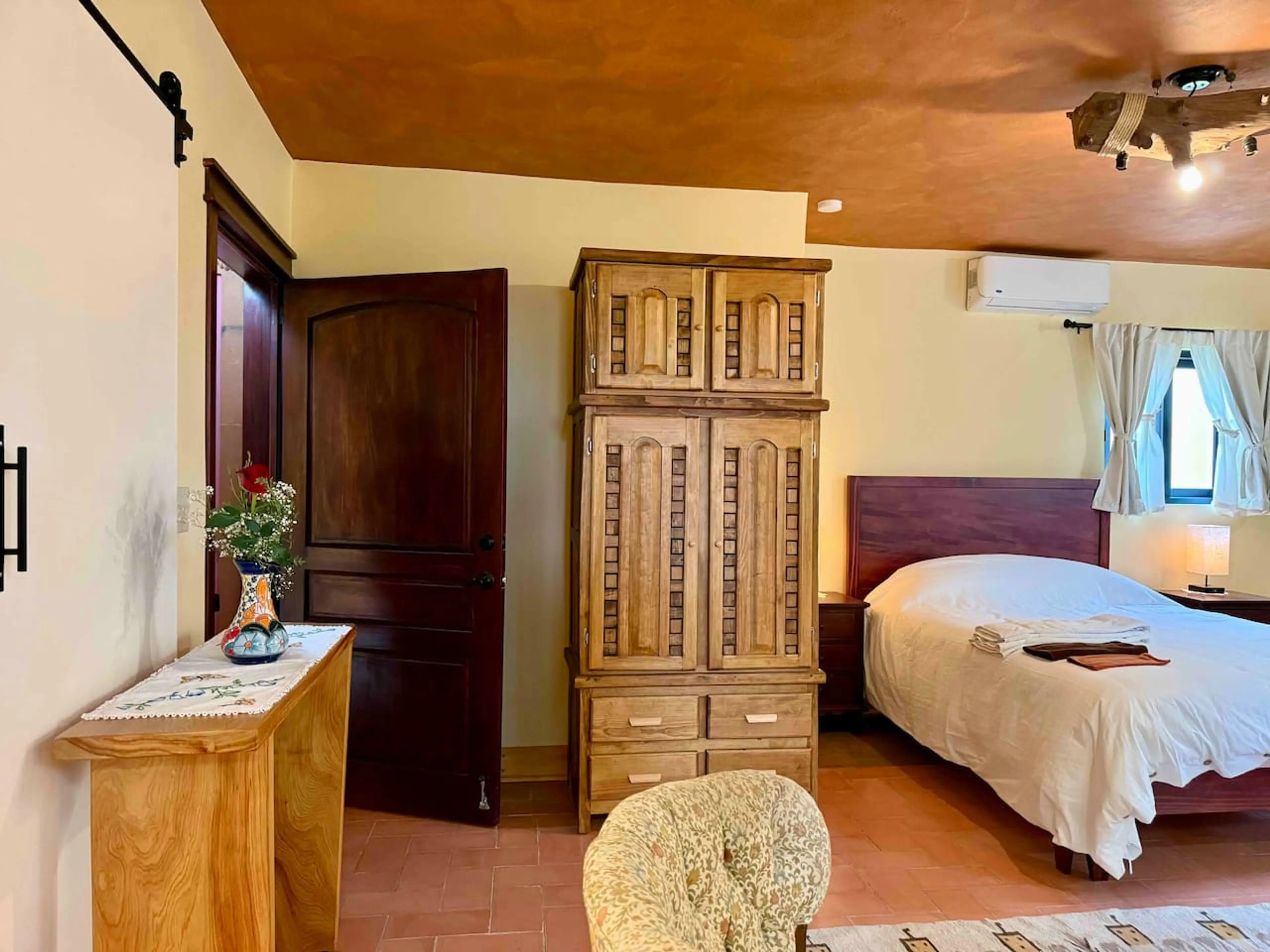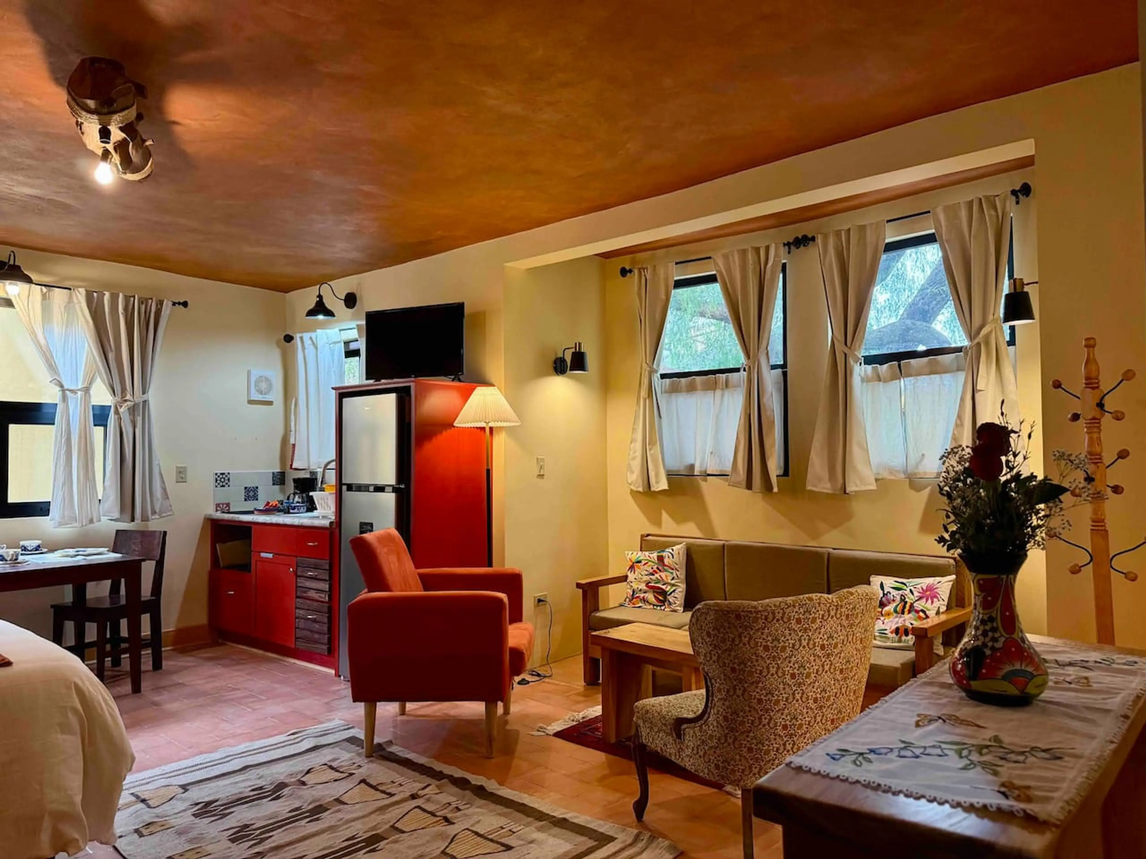 Bright, cozy suite on the second floor, comfortable space in San Miguel de Allende. Accessed by stairs, this suite offers rustic charm with modern comforts: Queen bed, a cozy seating area with an armchair, Smart TV, AC, heater for the colder months, and a kitchenette with an electric cooktop, refrig...